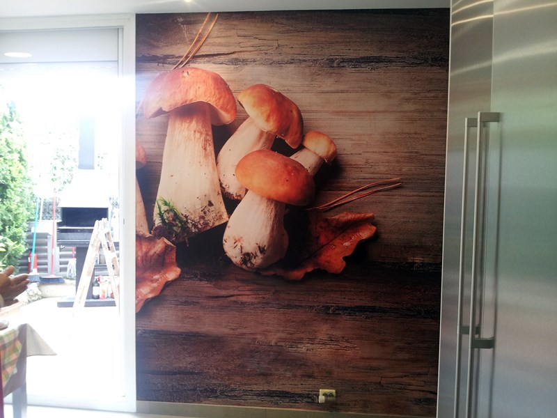 En este nuevo post os queremos enseñar un fotomurales personalizado en calidad vinilo autoadhesivo con motivos de setas y maderas que hemos instalado en una cocina en la población Sant Just Desvern ( Barcelona ). En cuanto al proceso de instalación en esta ocasión tuvimos que realizar una gran tarea en la preparación de la pared ya que estaba con estuco veneciano que se tubo que lijar y posteriormente esmaltar para asegurarnos la perfecta adherencia del mural.