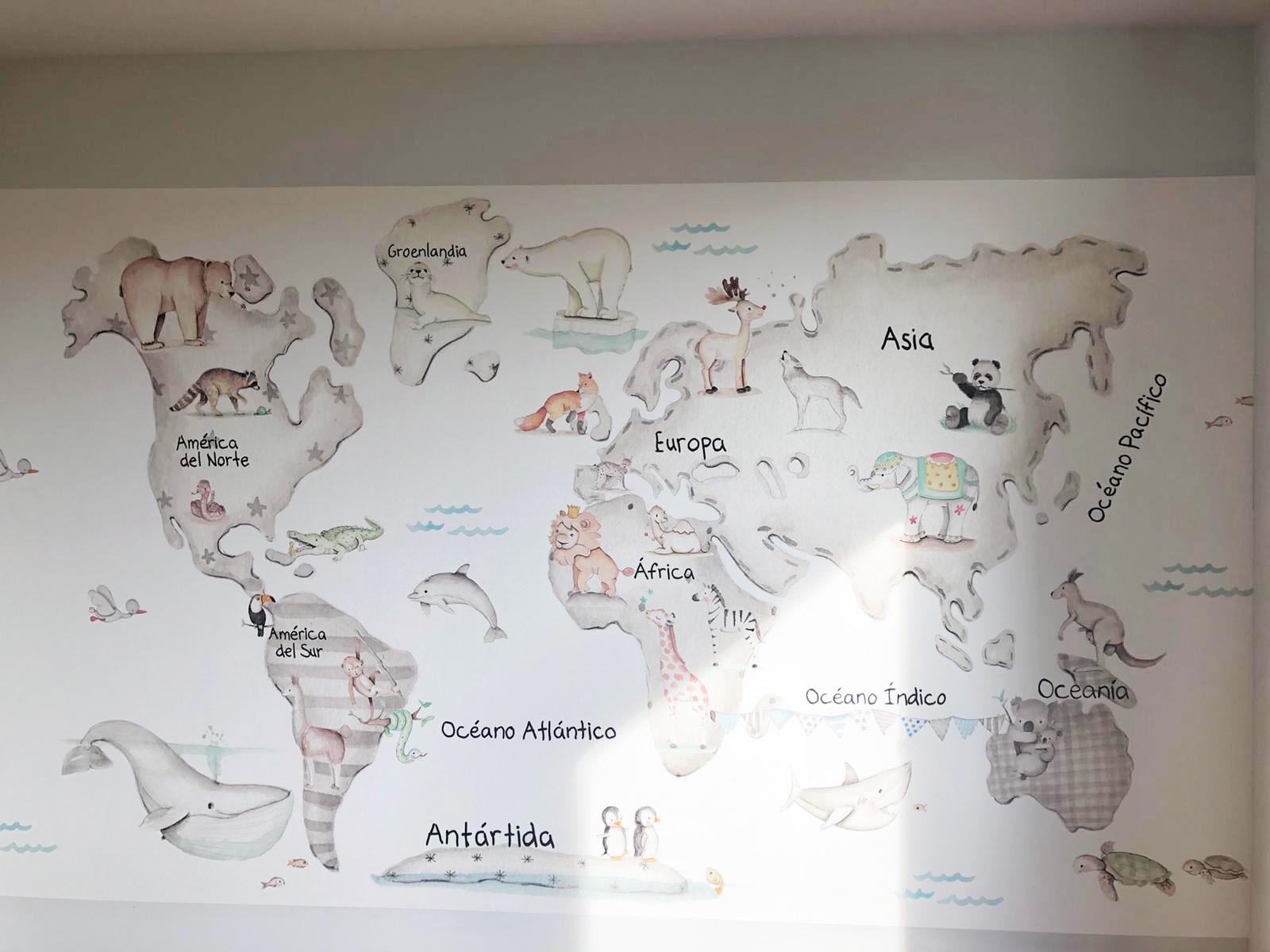 Actualmente los murales infantiles de mapamundis con animales son muy demandados , este tipo de diseños suelen tener los continentes con sus nombres, los océanos y seguidamente pequeñas ilustraciones de animales ubicación cada animal en la zona geográfica correspondiente, todo ello es creado con mucha imaginación y teniendo en cuenta que este tipo de decoración se empleara para bebes y recién nacidos por lo que principalmente se buscan ilustraciones muy amigables y alegres, así mismo sus tonalidades suelen ser muy neutras para crear un entorno relajado y tranquilo. A nosotros personalmente que nos encanta los murales de la marca Vinilart Colombia, tiene un equilibrio genial entre ilustración tonalidades así como un amplio abanico de mapas y estilos, si queréis ver su porfolio tan solo tenéis que entrar en Murales Infantiles Vinilart