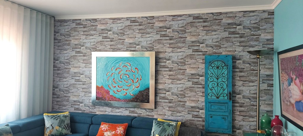 Bien es cierto que no todos los trabajos se empiezan con buen pie y que a veces surgen imprevistos sobre todo cuando hablamos de papel pintado, murales y vinilos decorativos, ya que hay una gran diversidad de calidades, productos y sistema de aplicación, en este caso nuestro instalador creía que se trataba de un papel pintado non woven por lo tanto cuando empezó a colocarlo por primera vez encolo la pared además del papel, el exceso de humedad provoco que el papel dilatara más de lo habitual generando bolsas y arrugas, por lo tanto tuvimos que actuar como auténticos profesionales que somos, retiremos todo el papel pintado de imitación a piedra que estaba mal instalado y empecemos el trabajo de 0 para conseguir un resultado optimo, como se suele decir las instalaciones como todo en esta vida no importan como empiezan, sino como acaban y esta claro que en este caso el resultado fue extraordinario.