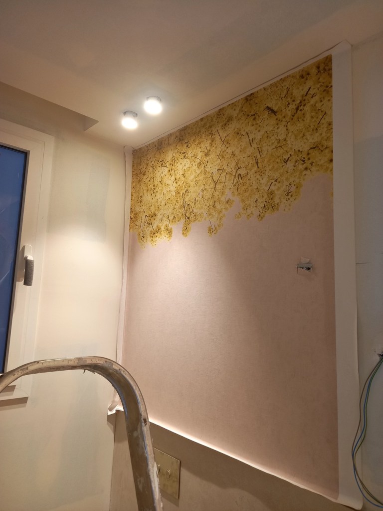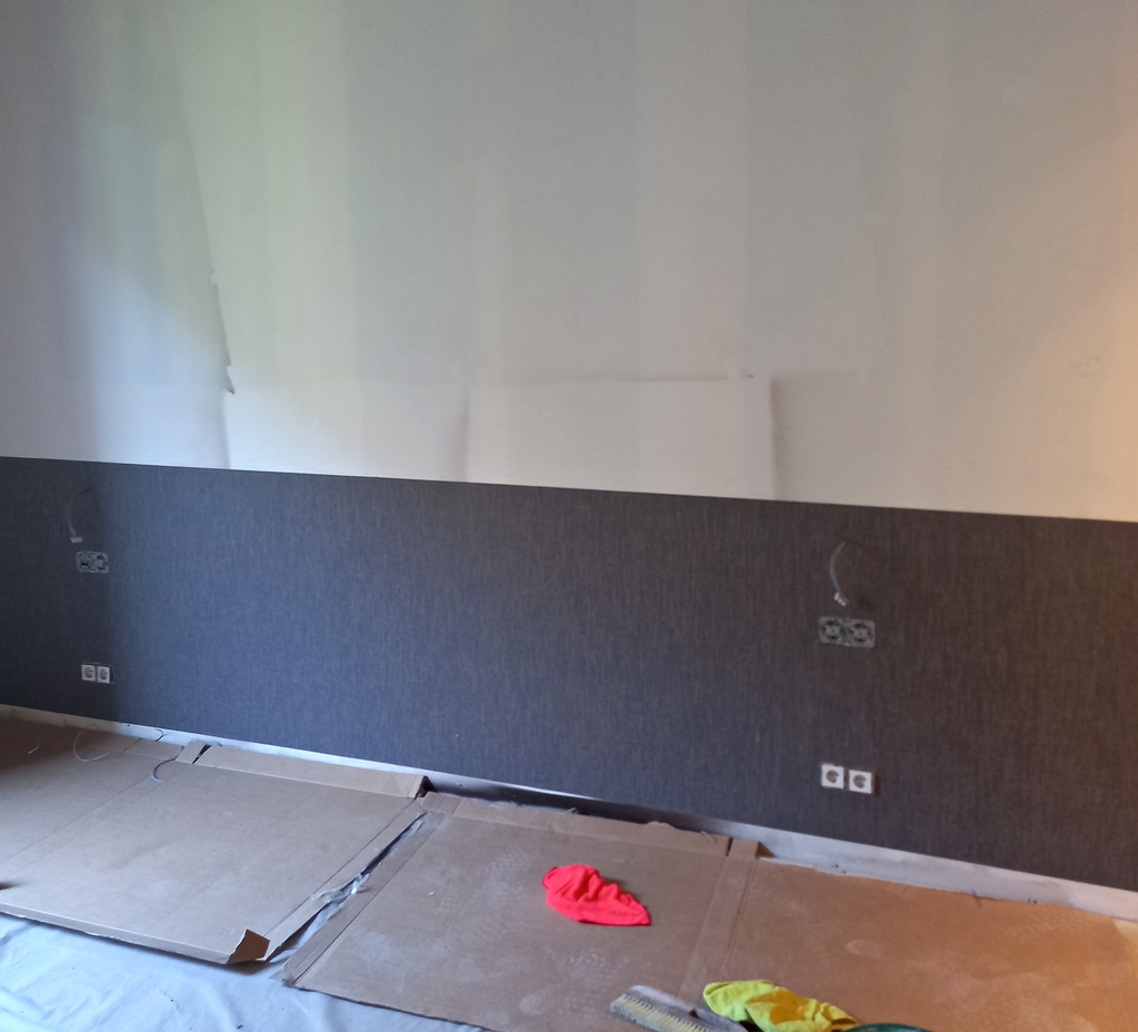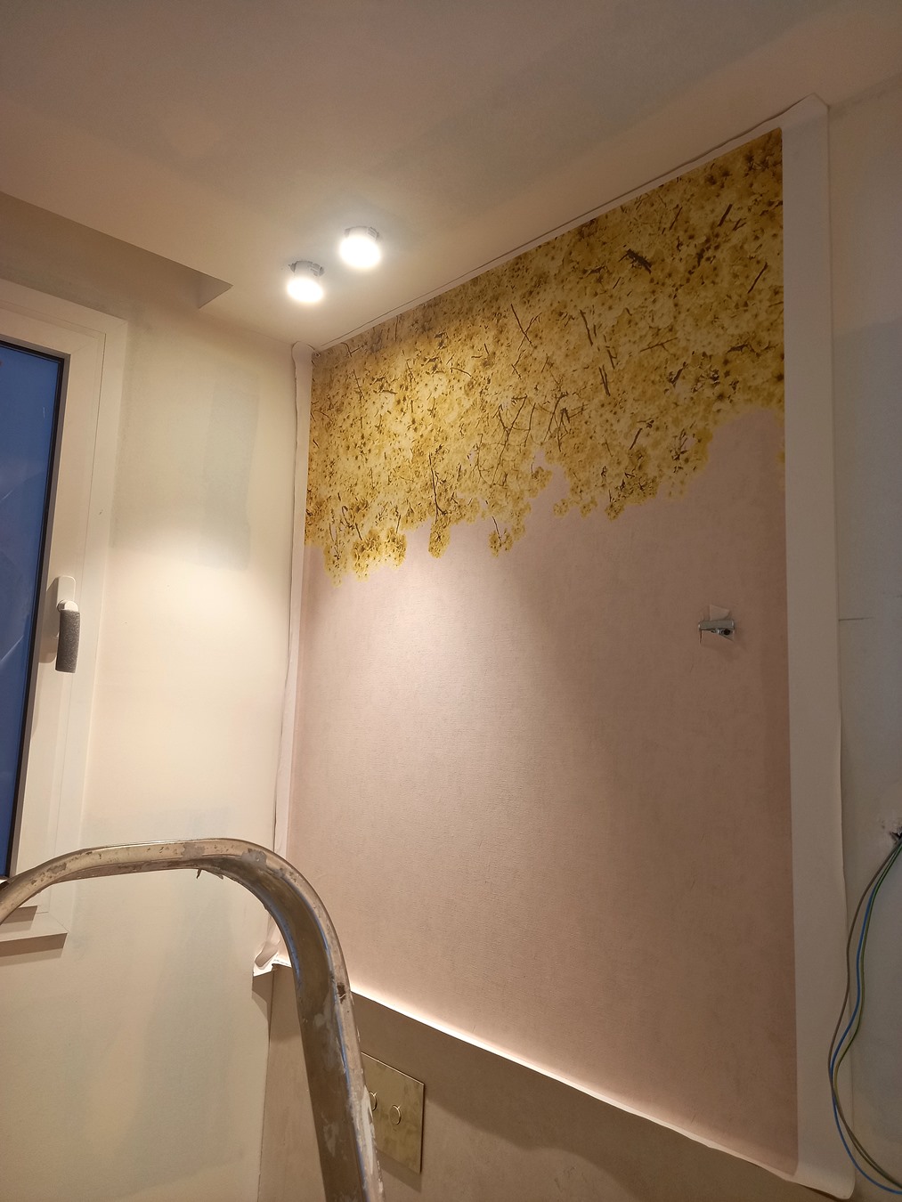 En este mismo trabajo tuvimos que instalar un arrimadero en lo que será la habitación de matrimonio de un papel pintado tipo textil de la marca Phillip Jeffries, es un tipo de tendencia que se esta poniendo de moda en nuestro pais y que el concepto es tener un cabecero de cama gigante del tamaño de la pared, en la imagen lamentablemente no podemos ver el efecto final de la parte superior que ira recubierto con listones de madera, pero imaginaríamos que será espectacular.