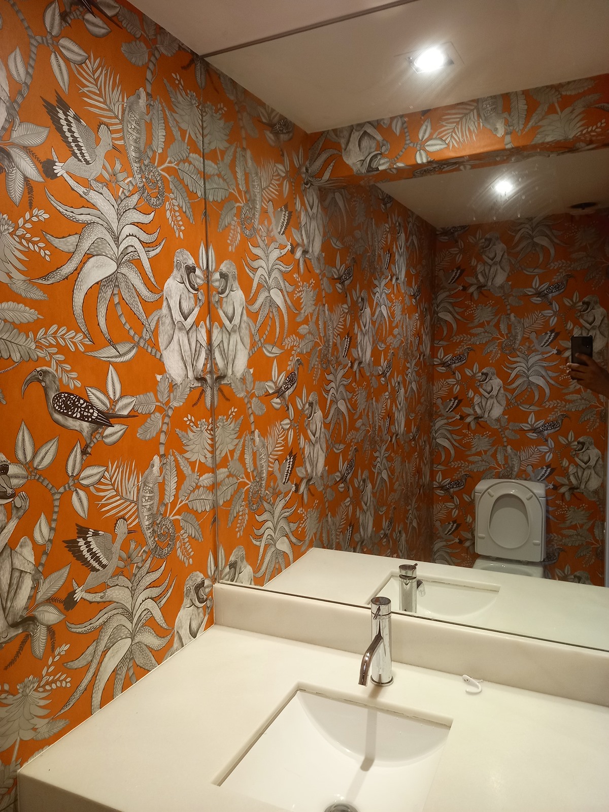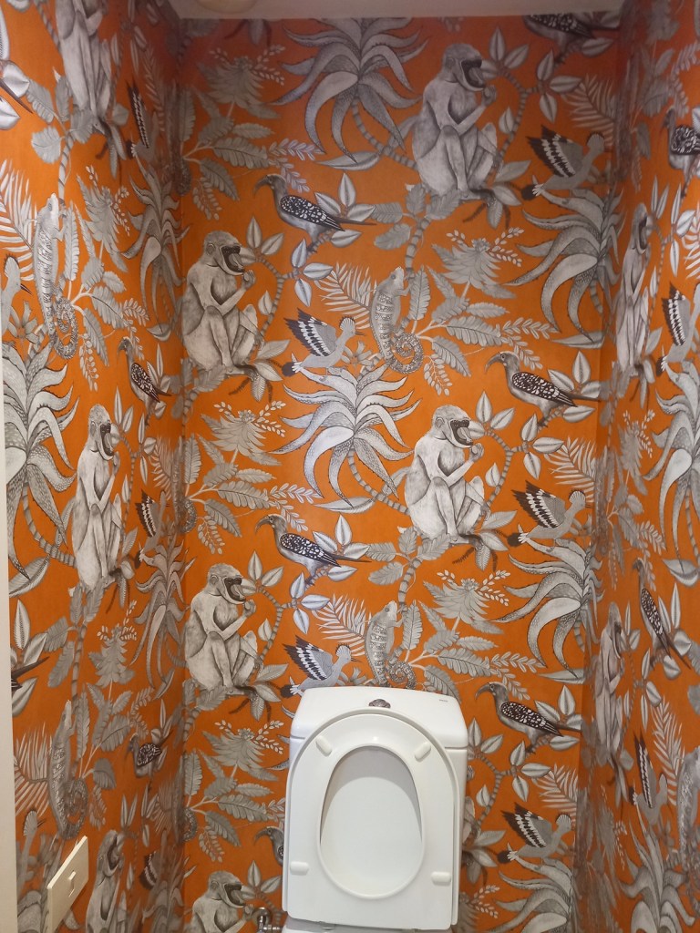 En el caso concreto de esta ultimo trabajo se trata del lavabo de unas oficinas, nuestro cliente tenia el cuarto de baño en color gris claro y querían que tuviera mucho más carácter, estilo y color para ello eligieron un papel pintado de la firma Británica Cole & Son, en concreto un papel pintado de la colección Ardmore no es un producto específicamente para cuartos de baño ya que su recubrimiento final no es vinílico, sin embargo la extraordinaria calidad de los papeles pintados de cole & Son garantizan una buena durabilidad, sin embargo si se busca un producto creado y específicamente para ello hay productos que son de un alto gramaje y además con acabado vinílico con tal de que se puedan lavar con una mayor facilidad , si buscan un producto de esas características te recomendamos visitar la siguiente selección papel pintado para cuartos de baño