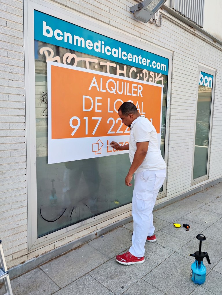 Nuestra segunda parada fue en la Ciudad de Badalona, donde tuvimos que rotular el cerramiento de unos locales con adhesivos de se alquila, esta obra concretamente se ha realizado en las calles Eduard Maristany y Providenza, en total una instalación y montaje de 5 carteles. Montador de Vinilos en Badalona.