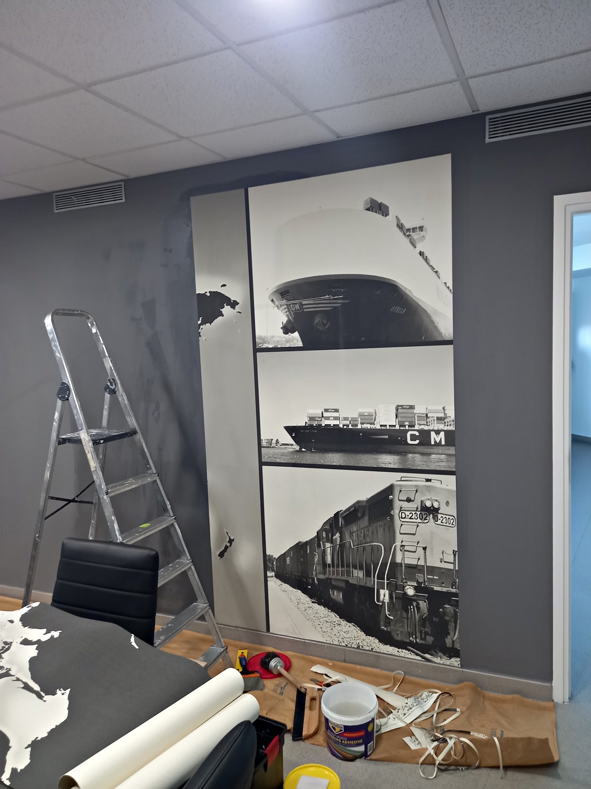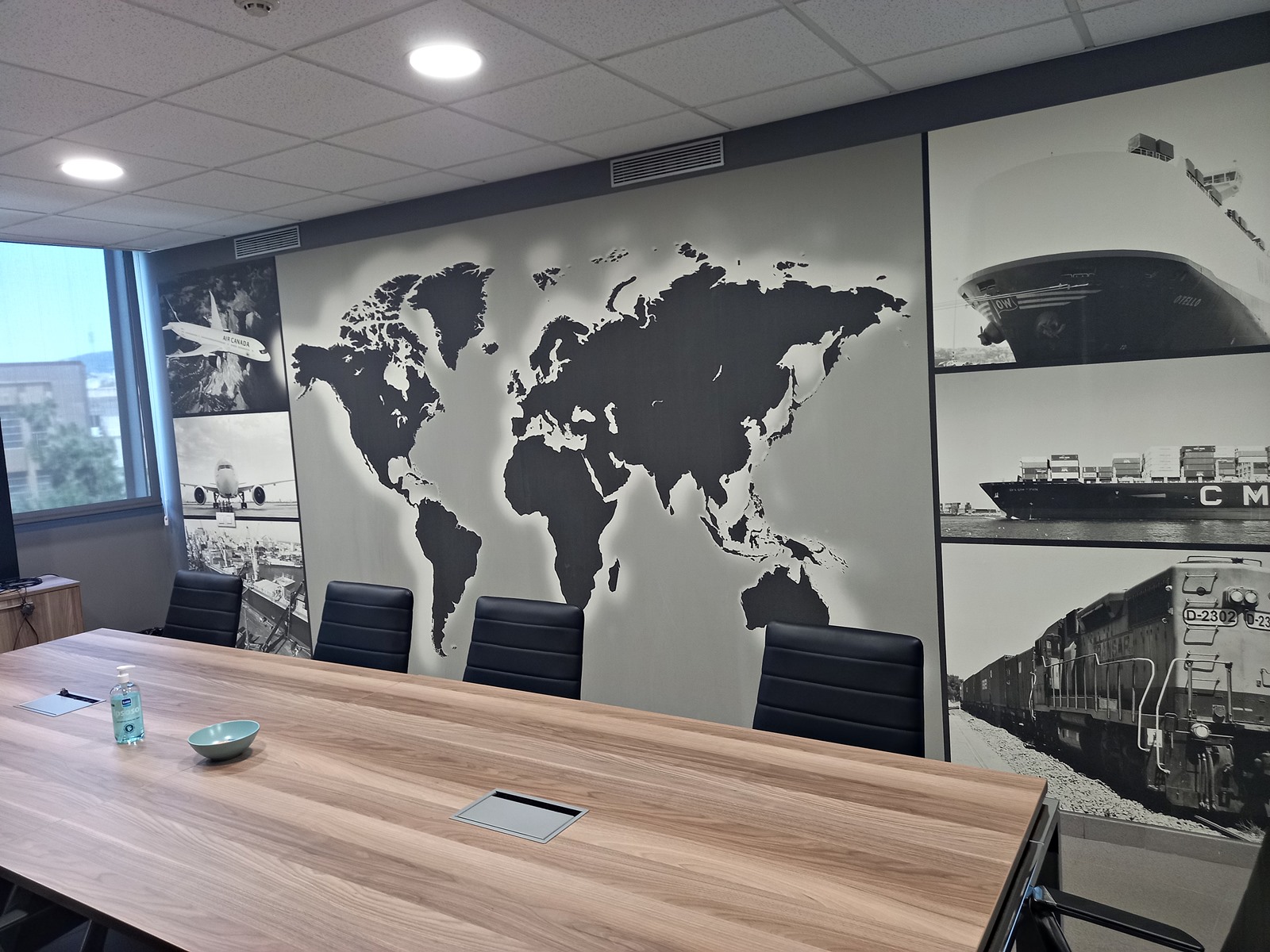 El primer mural que queremos enseñaros se ha instalado en la empresa de transportes Modaltrade del Grupo Agunsa, una empresa de habito internacional que quiere que las imágenes de sus oficinas a nivel mundial tengan una imagen igual y que trasmita a la perfección los valores y servicios que ofrece esta gran empresa.