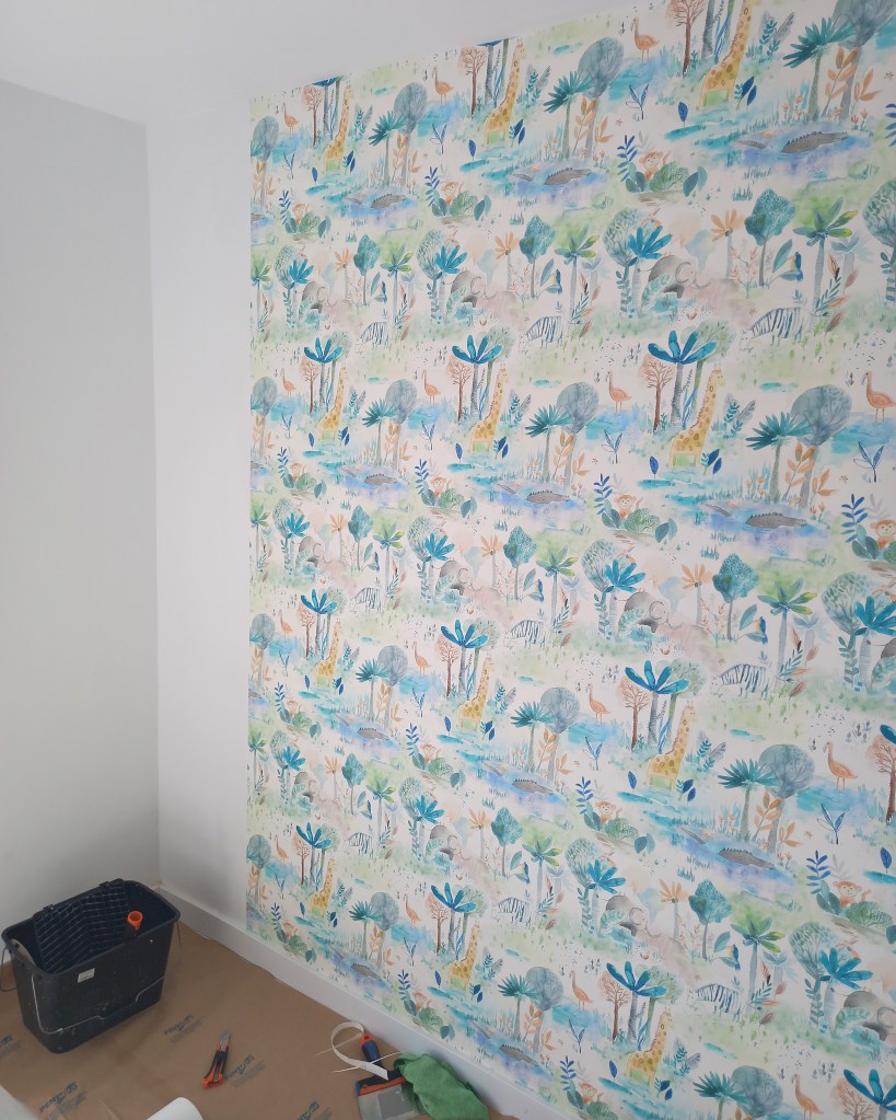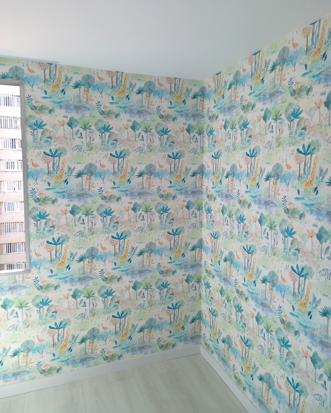 Estas buscando un empapelador profesional en L’Hospitalet del Llobregat? Bienvenidos a Empapelador Barcelona nuestra empresa esta especializada en la instalación de papel pintado, murales y vinilos tanto en la ciudad de Barcelona, como en las poblaciones cercanas, en el caso de este trabajo nos hemos desplazado hacia Hospitalet, concretamente al barrio de Bellvitge, donde hemos estado aplicando un papel pintado infantil llamado Jungle Fun de la tienda Gancedo de Barcelona de Rambla Cataluña.