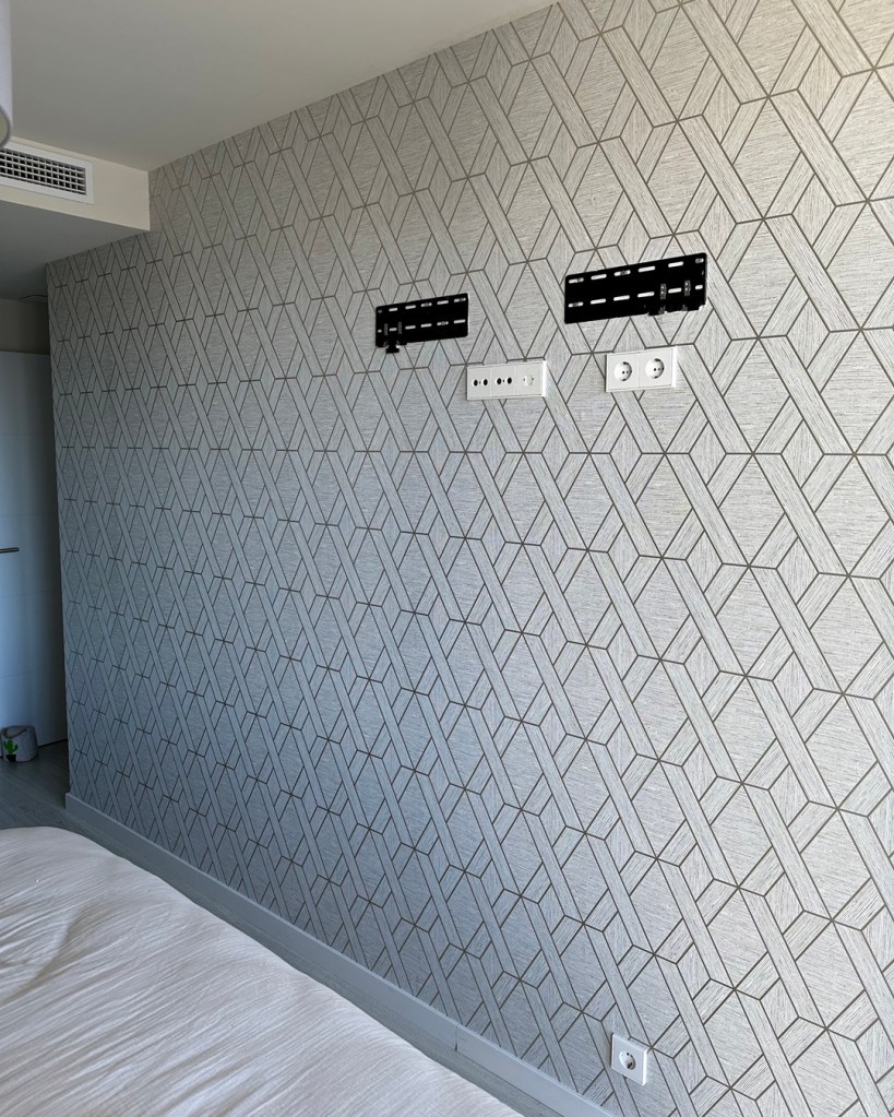 Concretamente en nuestra nueva aplicación hemos aplicado un papel pintado geométrico de rombos con un acabado tipo textil y el tipo de papel se trata de un papel tradicional, de los que se encola la parte trasera del papel, no es lo mas común en la actualidad ya que los grandes fabricantes como Rasch, As Creation, Erismann, Parato es prácticamente imposible encontrar este tipo de papel, sin embargo en países como Inglaterra o Estados Unidos todavía hay marcas que están apostando por el papel tradicional, supongo que dentro de unos años con la evolución cada vez será más difícil encontrar este tipo de líneas y tiene su lógica ya que los papeles de pared non woven son de más fácil instalación y además consiguen un acabado mucho mejor ya que no sufren dilatación alguna, si te gustan los patrones geométricos y quieres comprarlos por internet te recomendamos visitar el siguiente enlace papel pintado geométrico