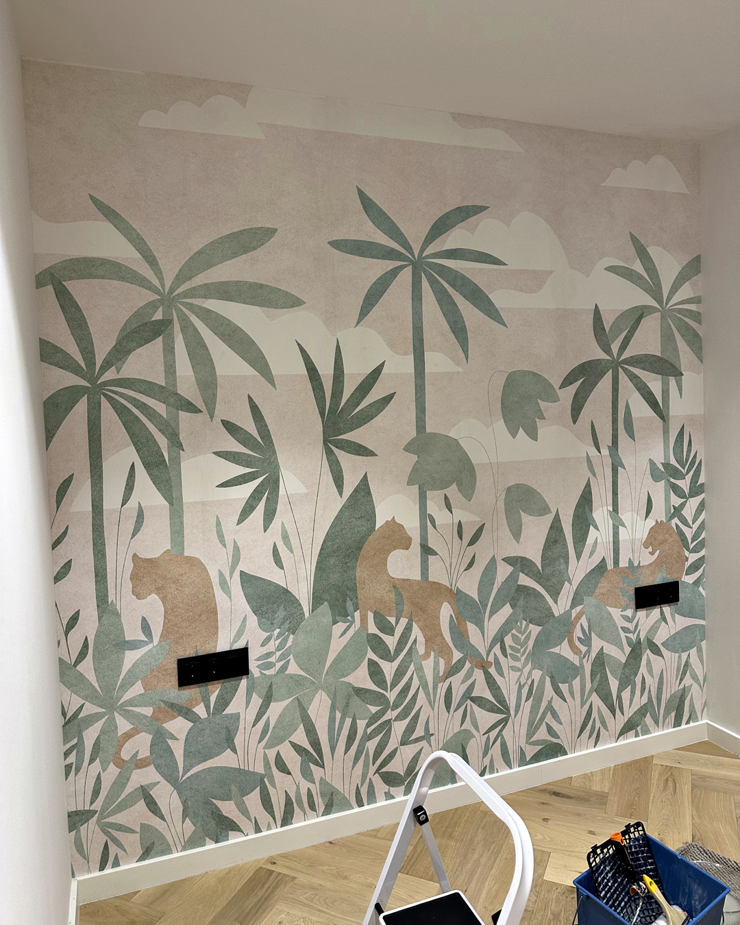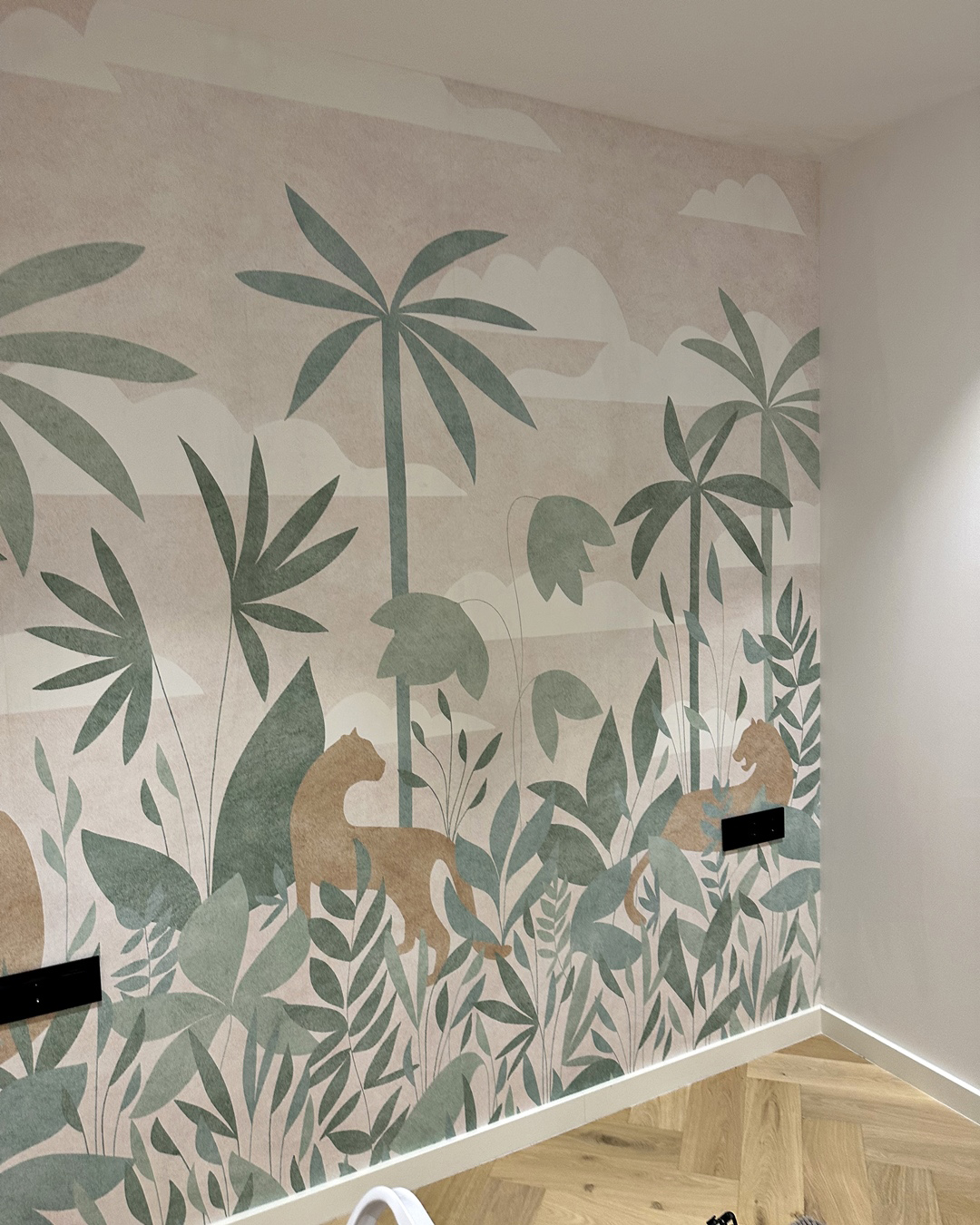 En Empapelador Barcelona hemos instalado muchísimas marcas de papel pintado, desde las más habituales como As Creation, Rasch, Marburg, Ich, Holden, Parato o marcas de murales como Komar, Idealdecor, FDC, Photowall, sin embargo esta es la primera vez que tenemos la oportunidad de instalar un mural de la firma francesa Isidore Leroy, lo que queremos destacar de esta marca es la buena calidad de impresión, incluso el tipo de papel pintado que es non woven, así como su formato al ser tiras de 50 cm se puede manipular con mucha facilidad y con ello se consigue que el resultado final sea muy bueno, en las siguiente fotografías se podrá observar la instalación completa del «Mural Paradise des Tigres» tambien queremos destacar el hecho de que el mural se fabrique a medida es una gran virtud ya que se consigue que la adaptación se 100% a la pared y no se pierda ningun elemento, ademas estos murales a diferencia del papel pintado en rollo son diseños menos repetitivos y visualmente mucho más atractivos.