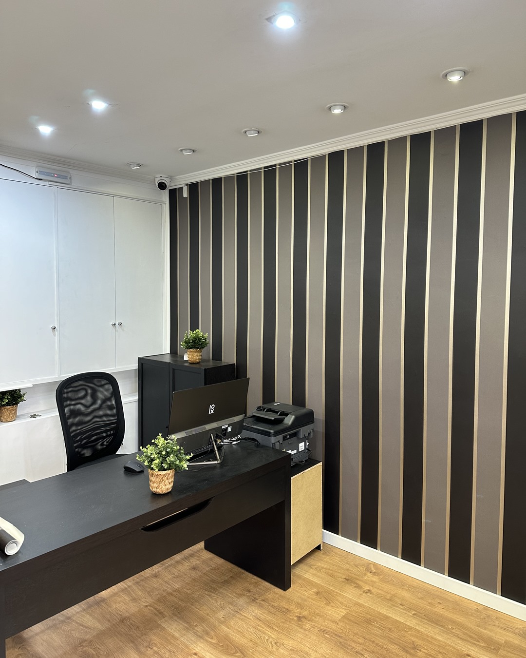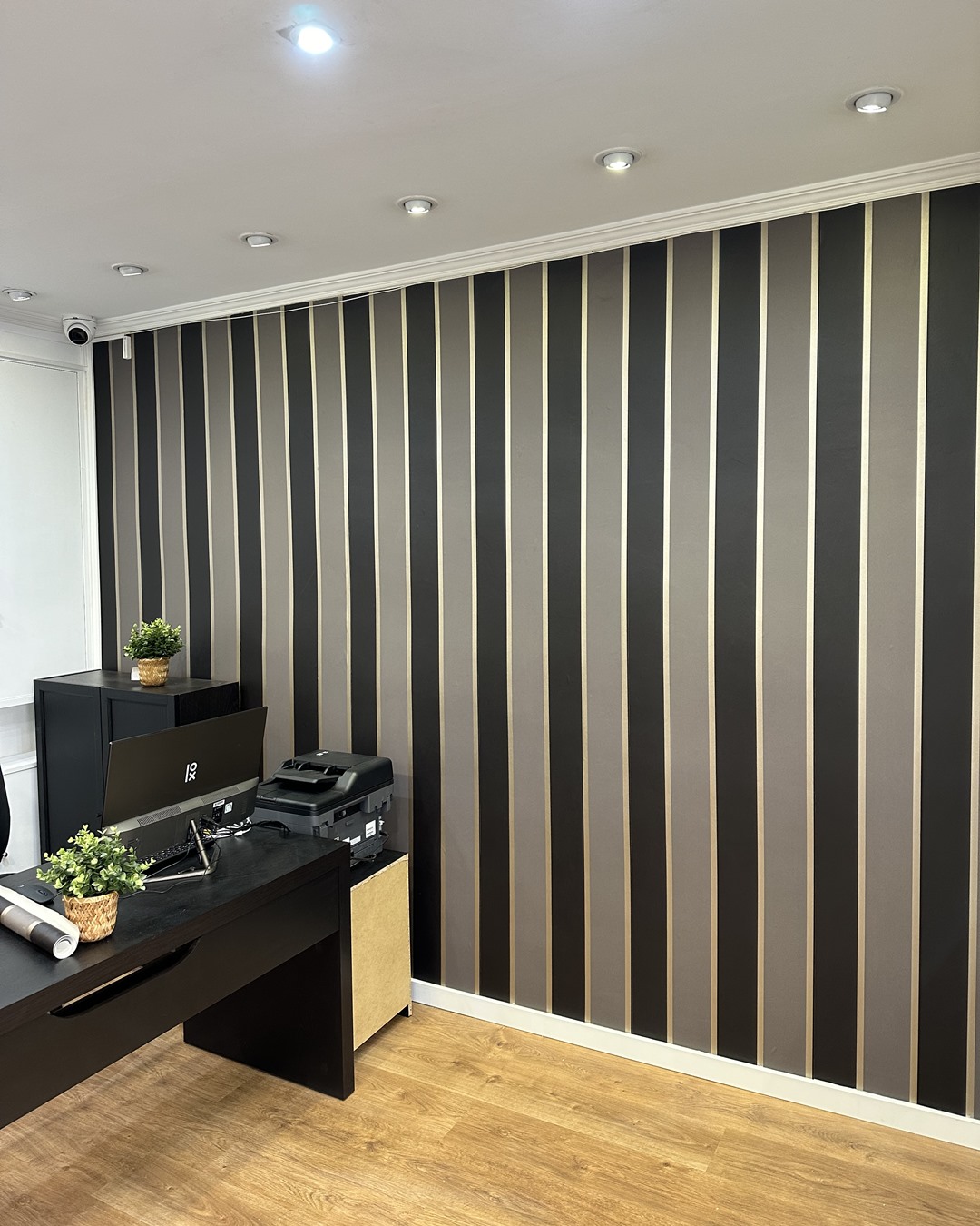 Esta semana en Empapelador Barcelona, nos complace compartir nuestra última instalación: un papel pintado de rayas que ha transformado por completo el ambiente de un nuevo local en la Calle Lisboa Nº3 de Barcelona. El propietario tenía una visión clara: quería infundir elegancia y lograr un impacto visual impresionante, al mismo tiempo que transmitía clase y seriedad al espacio.