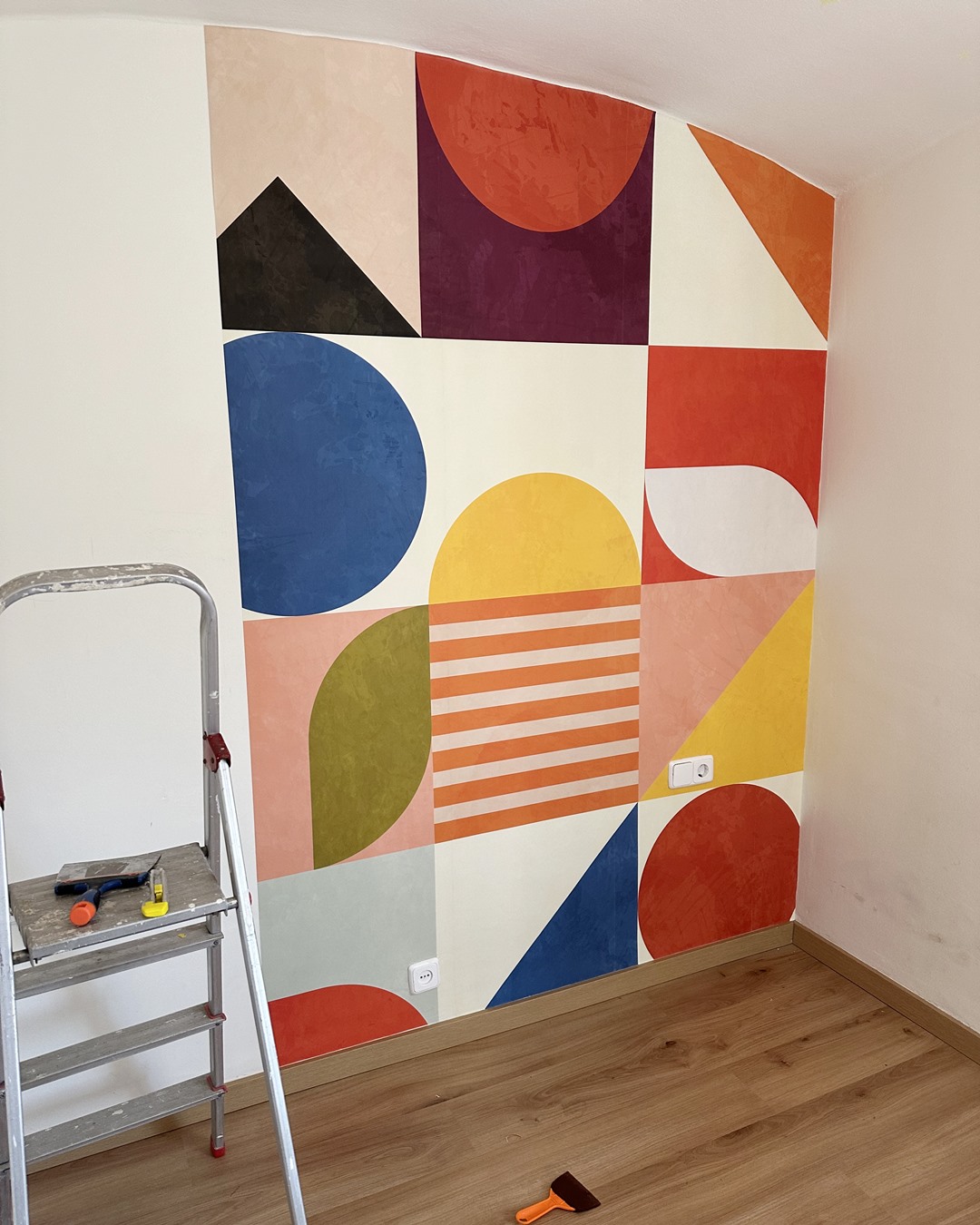 Además del desafío que supone el aspecto autoadhesivo, nos enfrentamos a otra dificultad añadida: las figuras y formas geométricas. Los papeles pintados geométricos suelen ser algunos de los diseños más exigentes. En el caso que nos ocupa hoy, nos encontramos con círculos de grandes dimensiones, triángulos y diversas formas que requieren un ajuste preciso. El alineamiento perfecto es crucial, especialmente para que las formas geométricas completen su diseño de manera adecuada. De lo contrario, cualquier error en el alineamiento será evidente, afectando la integridad del patrón. Por tanto, la instalación de este tipo de diseños requiere la experiencia y habilidad de personal cualificado. En Empapelador Barcelona, contamos con un equipo con amplia experiencia en la instalación de este tipo de diseños y productos. A lo largo de los años, hemos decorado numerosas paredes y estamos preparados para afrontar cada trabajo con excelencia y precisión.