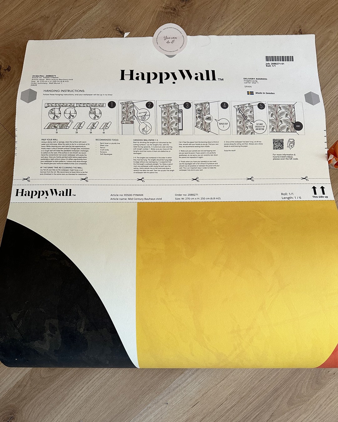 En el caso concreto de hoy estamos trabajando con un papel pintado autoadhesivo de la marca HappyWall, con un diseño geométrico multicolor. Este papel será instalado en una habitación infantil y se destaca por sus formas, figuras y colores, convirtiéndolo en una opción ideal para añadir alegría y diversión al espacio. Bajo el nombre de «Mid Century Bauhaus Vivid», este papel pintado autoadhesivo es parte de la línea «Peel & Stick», lo que significa que su parte posterior está equipada con una capa autoadhesiva. Aunque los productos autoadhesivos pueden parecer más fáciles de instalar a primera vista, la realidad es que pueden presentar sus propios desafíos, ya que requieren un cuidado especial para evitar burbujas y asegurar una colocación precisa. Sin embargo queremos resaltar por encima de todo que este papel pintado geométrico nos parece una excelente opción para decorar espacios infantiles