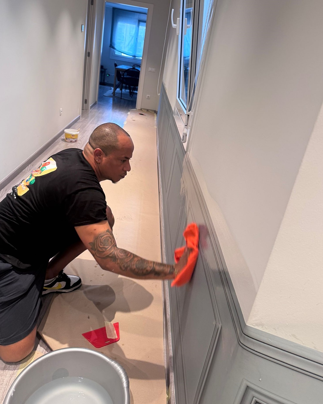Aunque la historia va más allá de una simple instalación. El cliente nos contactó mientras tenía en casa a un pintor que estaba renovando toda la pintura del domicilio. Sin embargo, cuando llegó el momento de colocar esta maxi cenefa, el pintor no supo cómo abordar el proyecto y llegó a decirle que instalarla en el recibidor podría llevarle hasta cuatro días de trabajo. Una estimación que no tiene sentido, ya que colocar este tipo de cenefas es prácticamente igual que instalar un rollo de papel pintado de 70 cm de ancho.