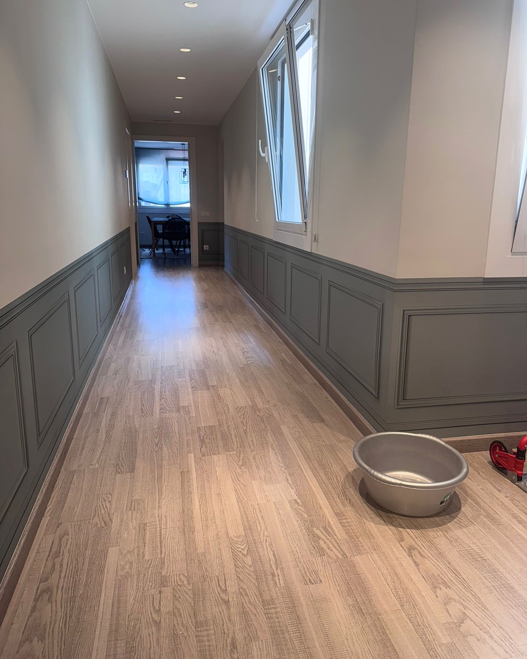 El nuevo trabajo que os presentamos se realizó en el Carrer Rosselló 48, en el barrio del Eixample de Barcelona, una zona céntrica y emblemática de la ciudad, reconocida por sus edificios de estilo modernista. Crear en este recibidor un arrimadero de papel pintado con efecto de molduras supone mantener, en el interior del domicilio, la misma sintonía y elegancia que caracteriza al barrio.