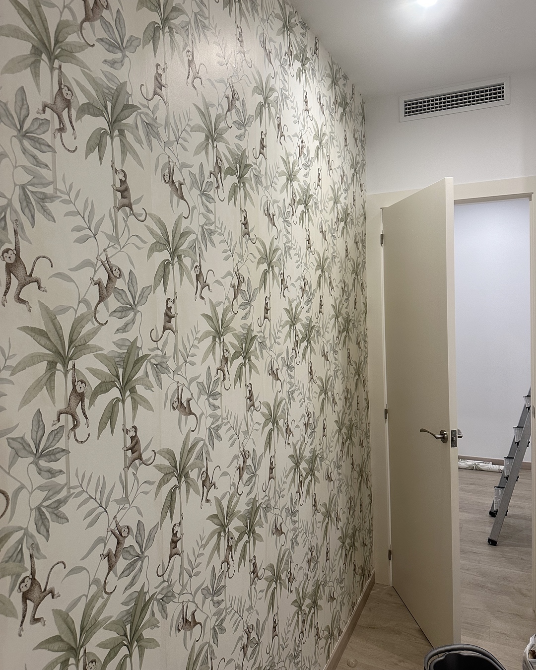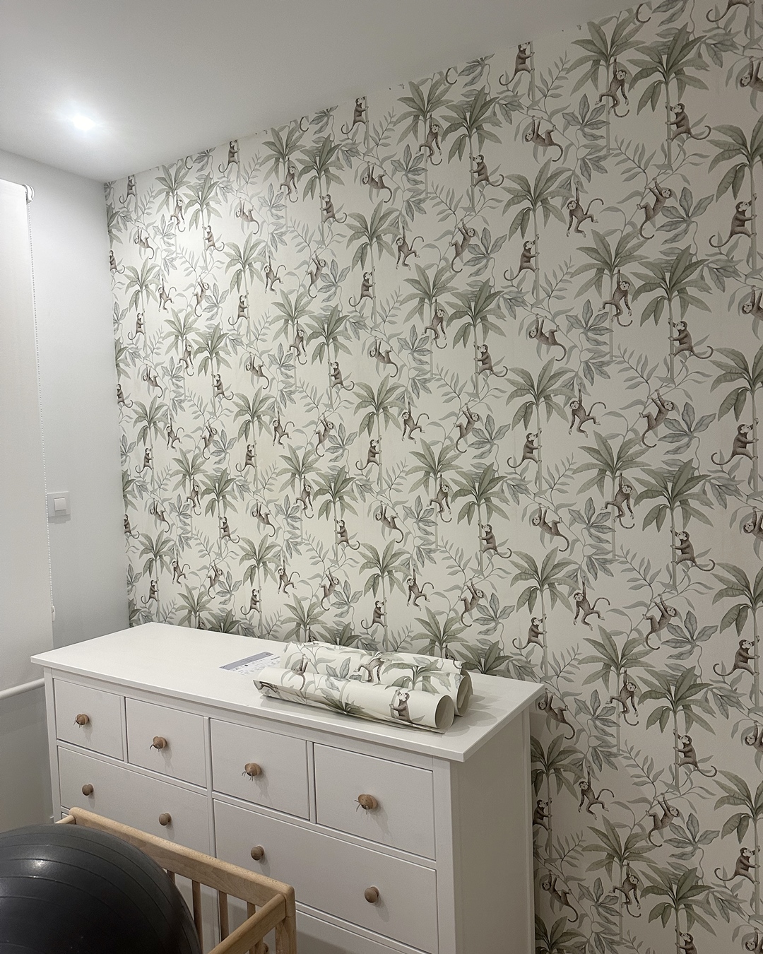 Visualmente, el uso del papel pintado Jungle Friends de la colección Newbie ha dado vida a las paredes, ya que su diseño combina palmeras, hojas de enredadera y simpáticos monitos que trepan y juegan entre la vegetación. Gracias a este estampado, se rompe la frialdad de las paredes blancas y se consigue un ambiente mucho más alegre, envolvente y armonioso.
