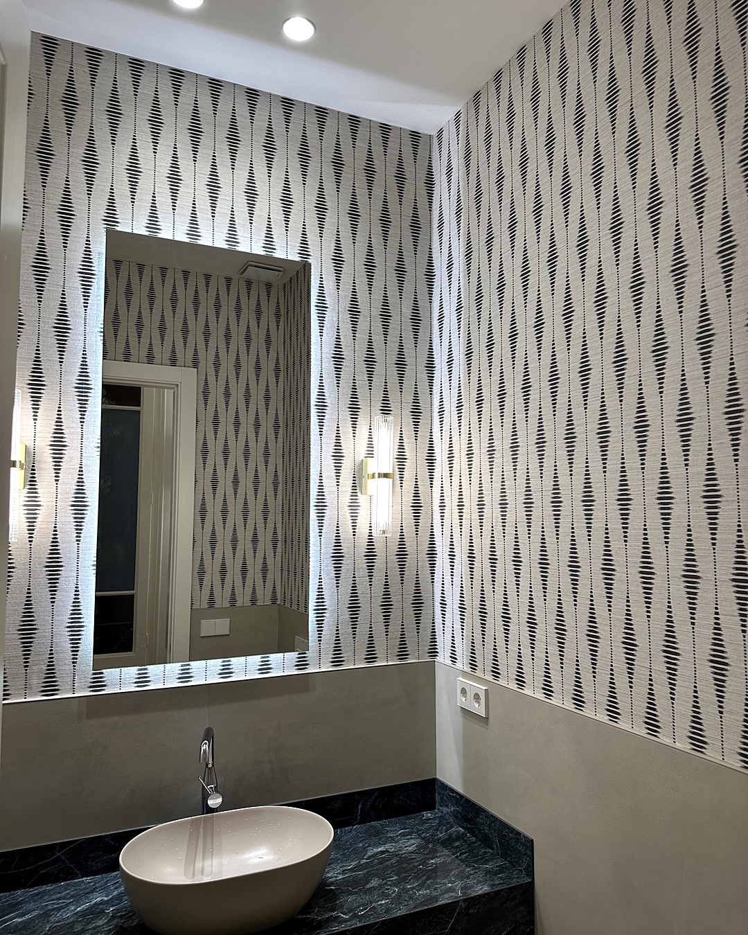papel pintado tribal vinílico resistente a la humedad instalado en baño